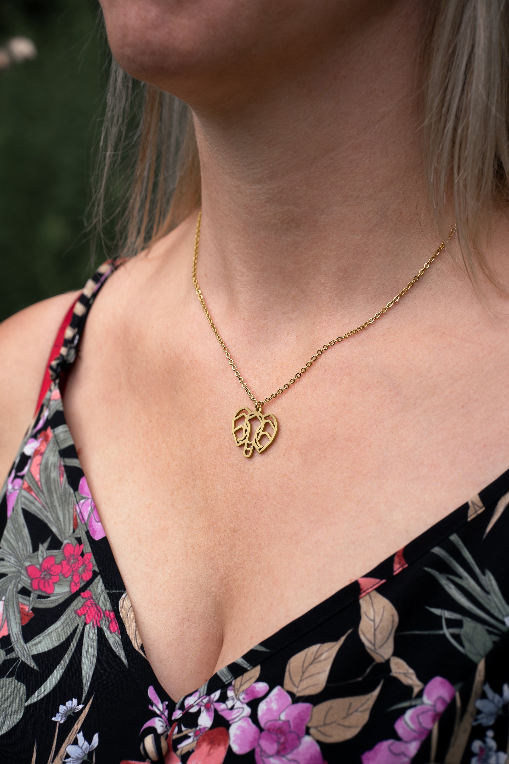 • Pendentif de 22 x 19 mm, monté sur une chaîne de 15 cm avec une extension de 3 cm, d’une épaisseur de 2 mm.